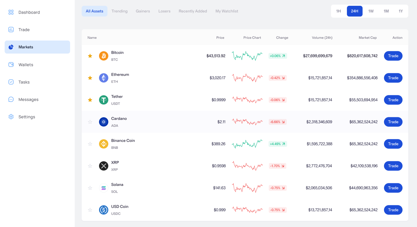 Handel med top digitale aktiver som Bitcoin, Ethereum og Solana med præcision. Vores AI analyserer løbende blockchain-tendenser og markedssignaler for at identificere optimale ind- og udgangspunkter.